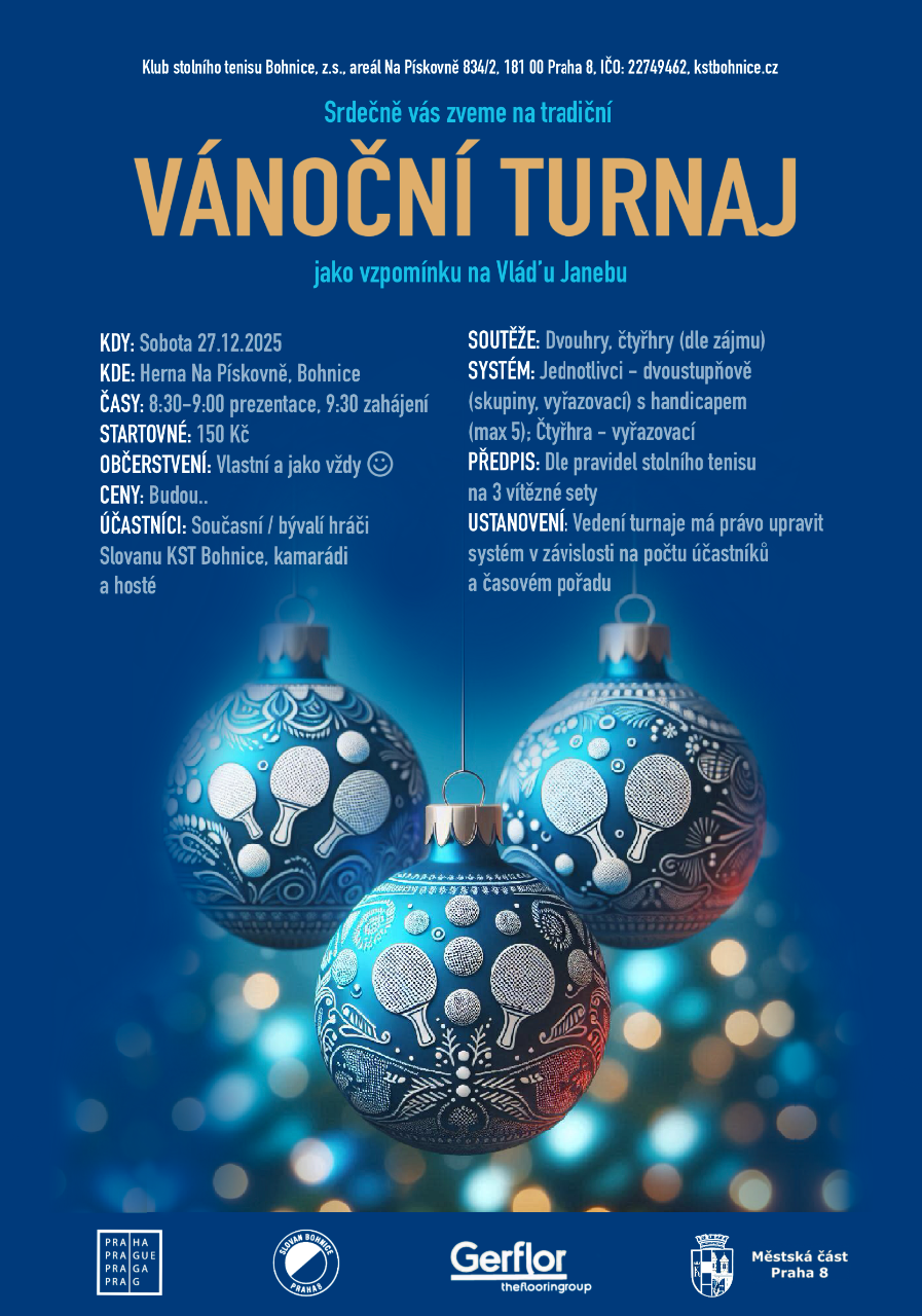 Srdečně zveme všechny hráče Slovanu KST Bohnice, přátele a hosty na tradiční Vánoční turnaj konaný 27.12.2025. Více níže: