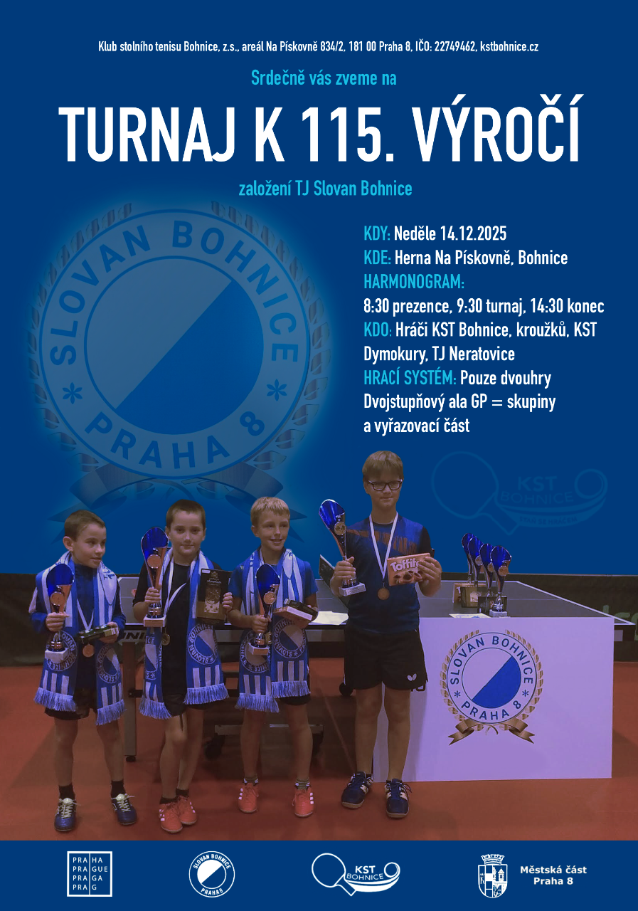K příležitosti 115. výročí Slovanu Bohnice zveme všechny hráče KST Bohnice, pořádaných kroužků, KST Dymokury a TJ Neratovice na turnaj, pořádaný dne 14.12.2025.